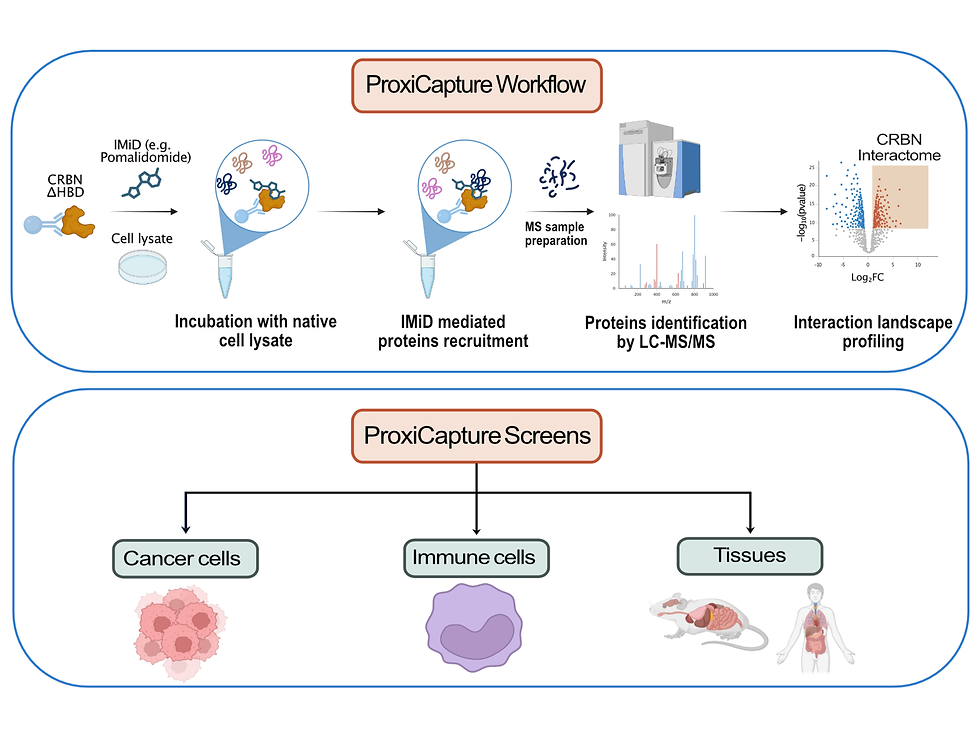 When applied across multiple cancer cell lines, different immune cell states, and paired healthy and tumor tissues, ProxiCapture revealed that the interaction patterns of molecular glues are highly dependent on the specific cell or tissue type. In total, the study identified 121 CRBN-associated proteins, including many previously unknown and context-specific targets.